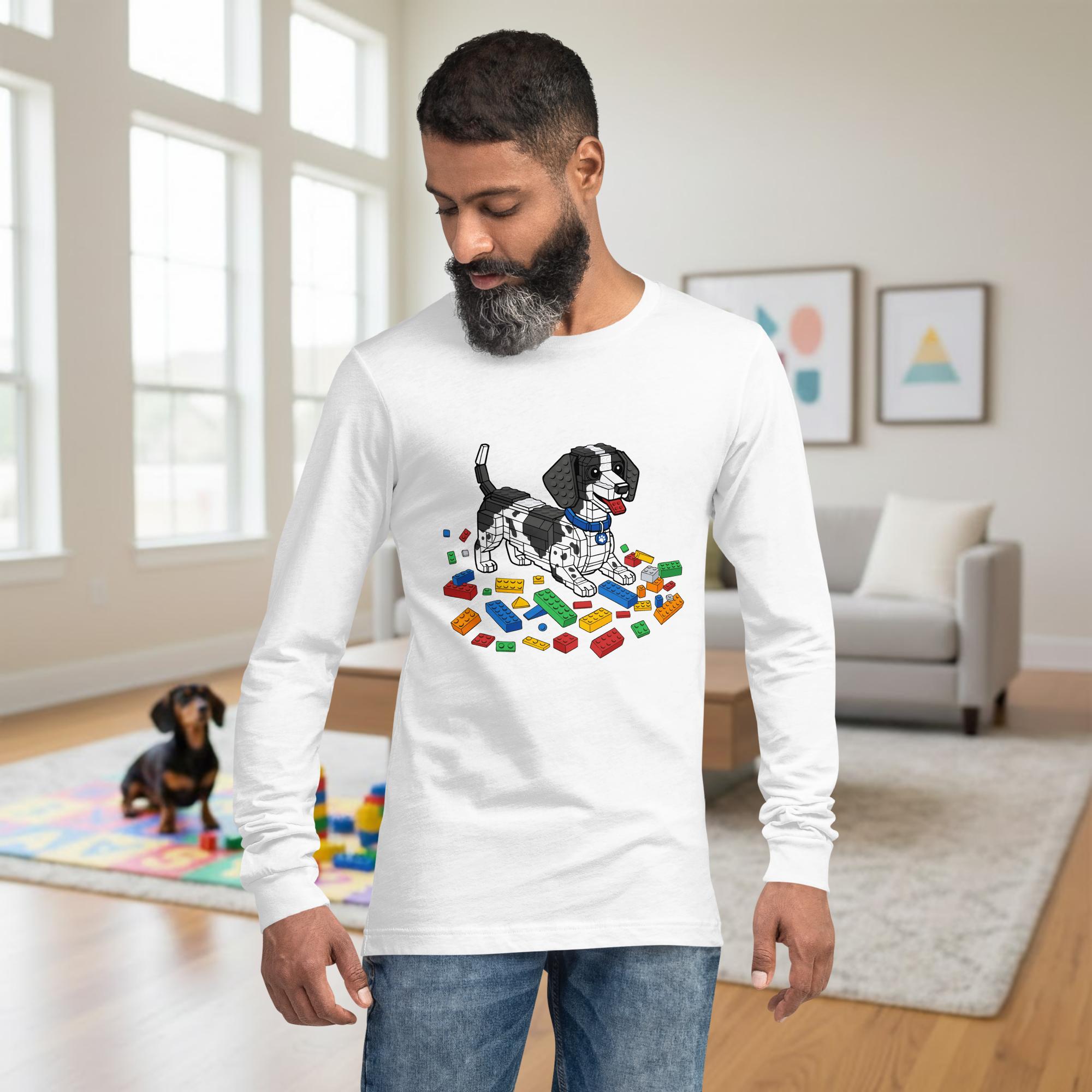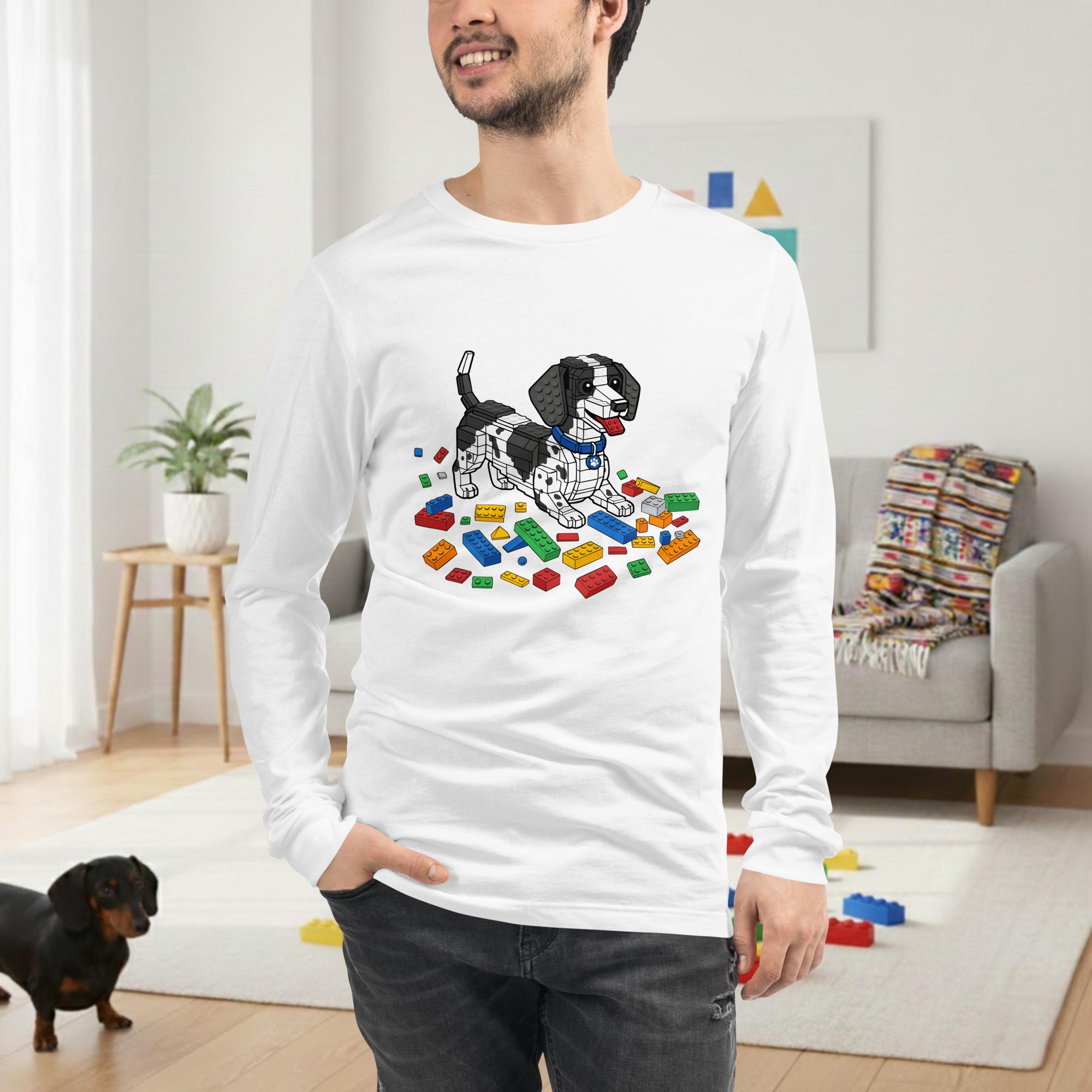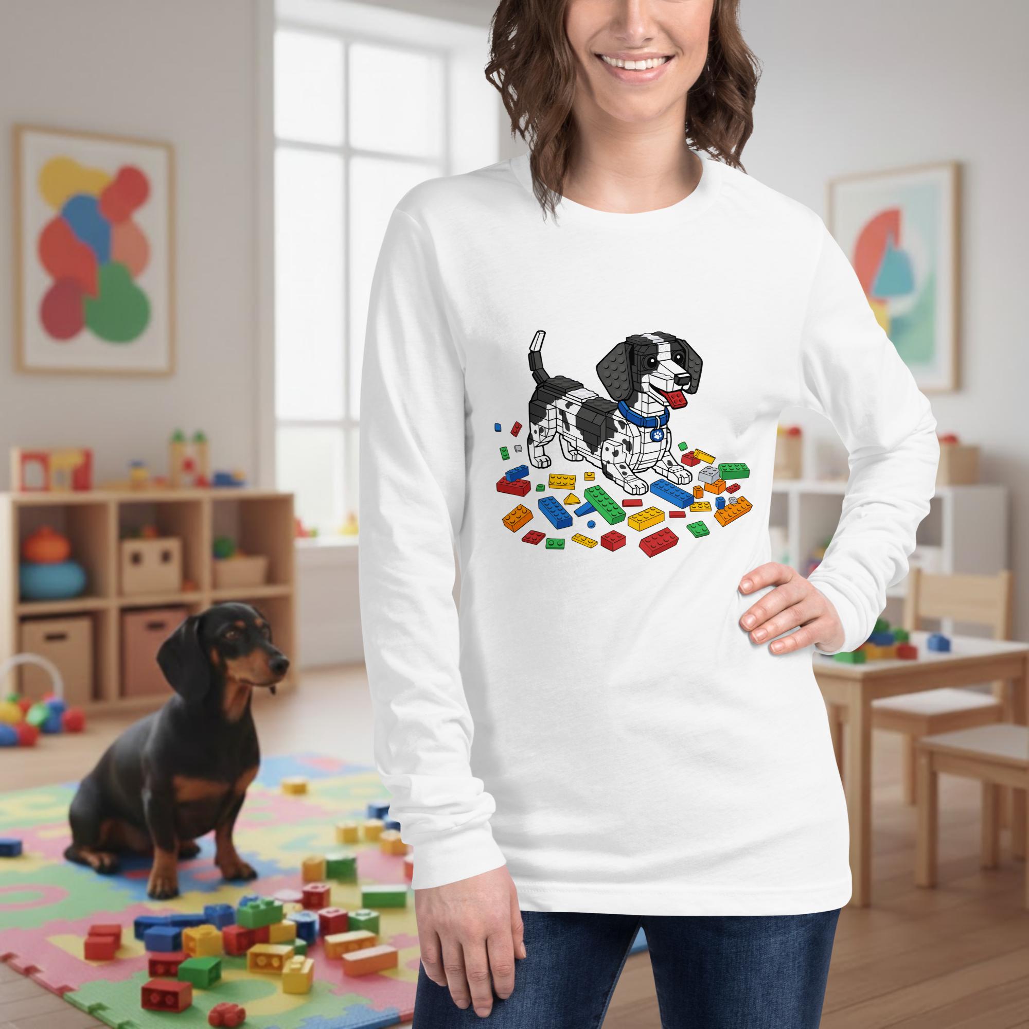 A nostalgic, unisex long sleeve tee featuring a clever dachshund “built” from colorful interlocking toy bricks. Perfect for Doxie lovers who appreciate a whimsical, retro aesthetic and premium, year-round comfort.
