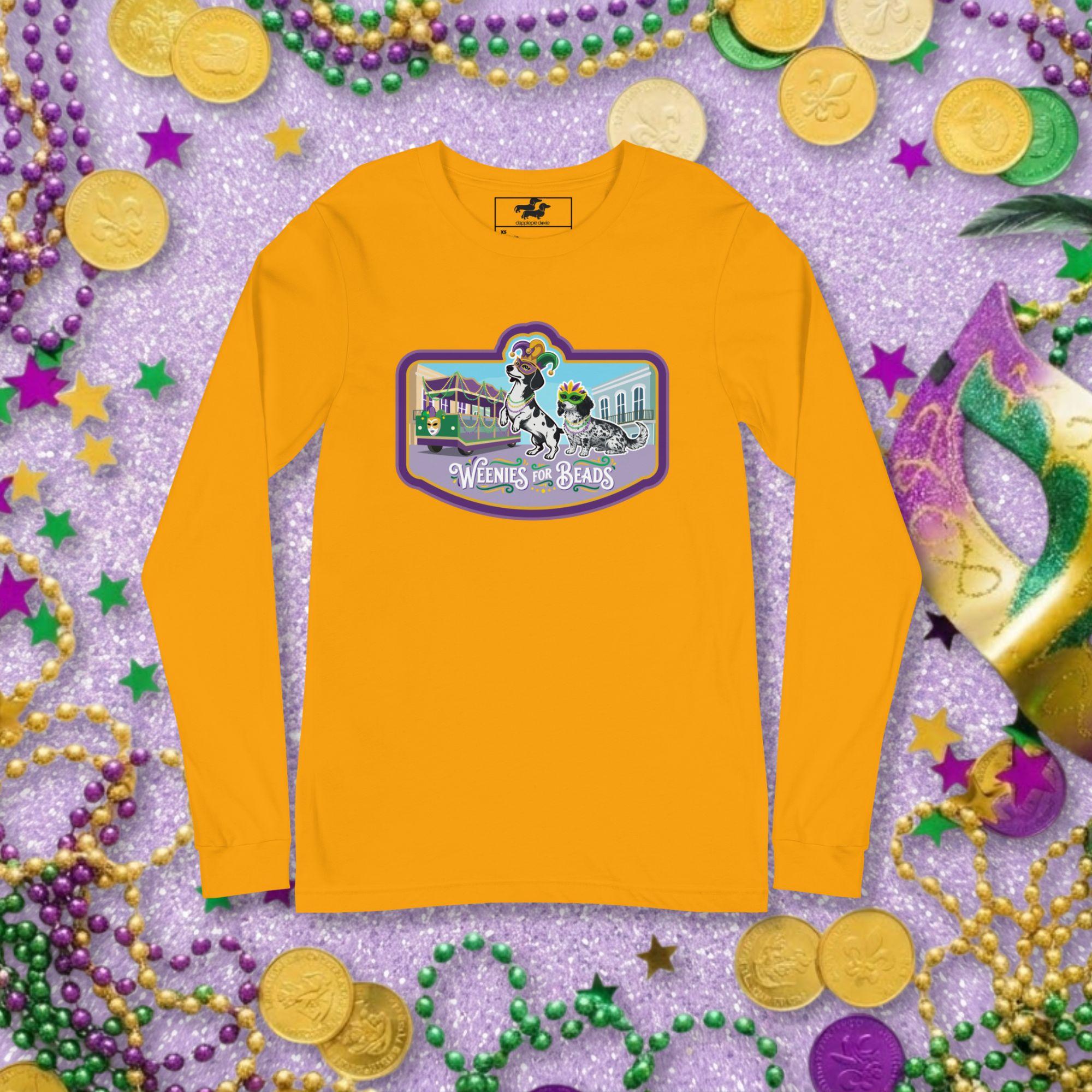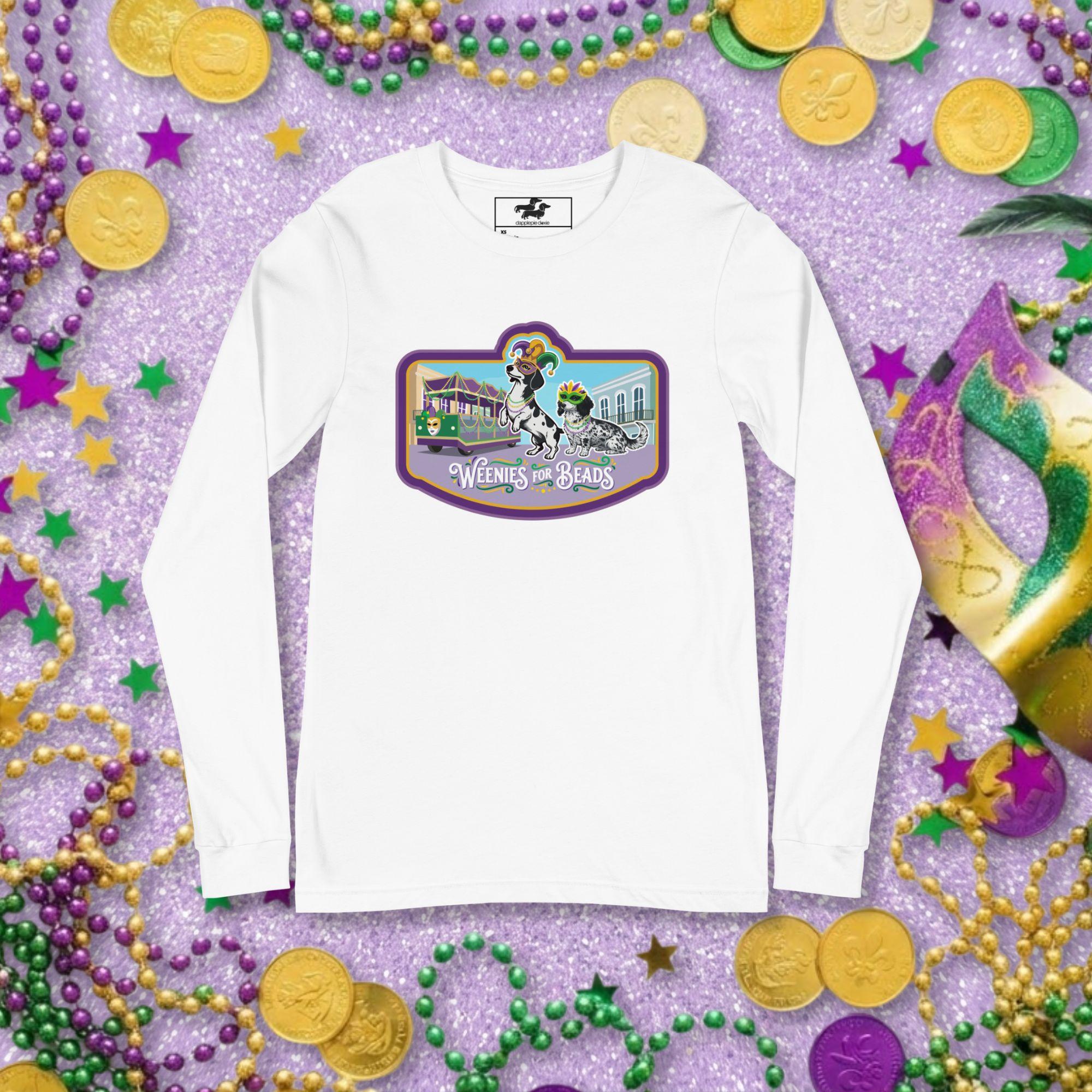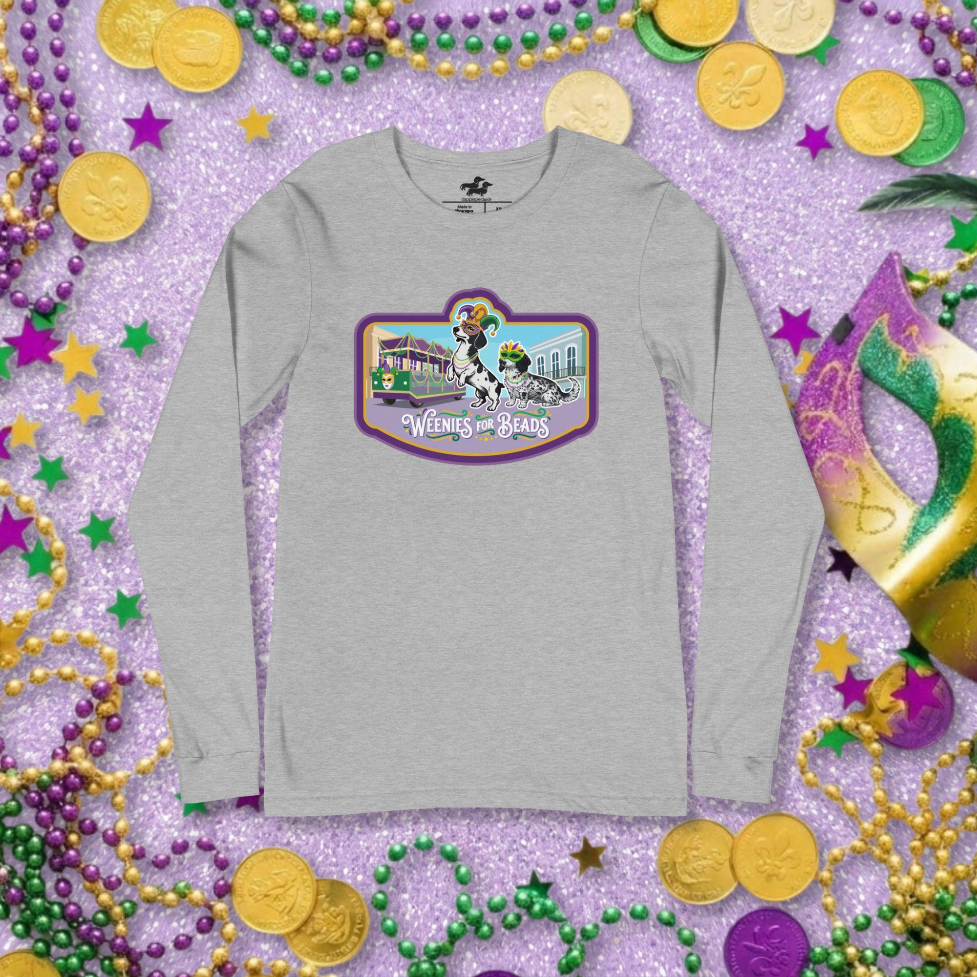 The exclusive “Weenies for Beads” design features a spirited dachshund decked out in traditional purple, green, and gold. It’s a playful nod to the breed’s legendary persistence—because we all know a Doxie will do just about anything for a prize! This long-sleeve version offers a bit more warmth for those crisp Carnival days while keeping the festive spirit front and center.