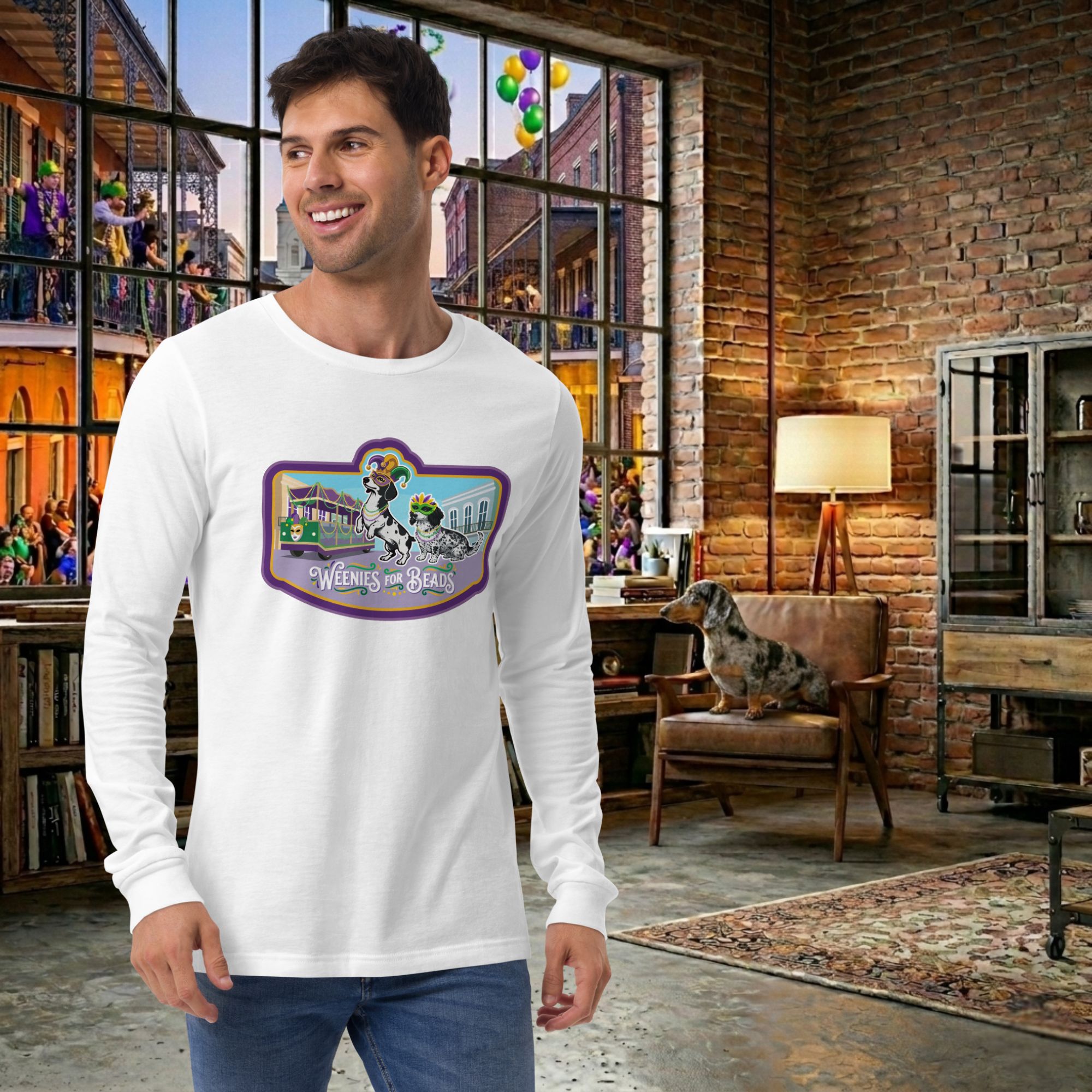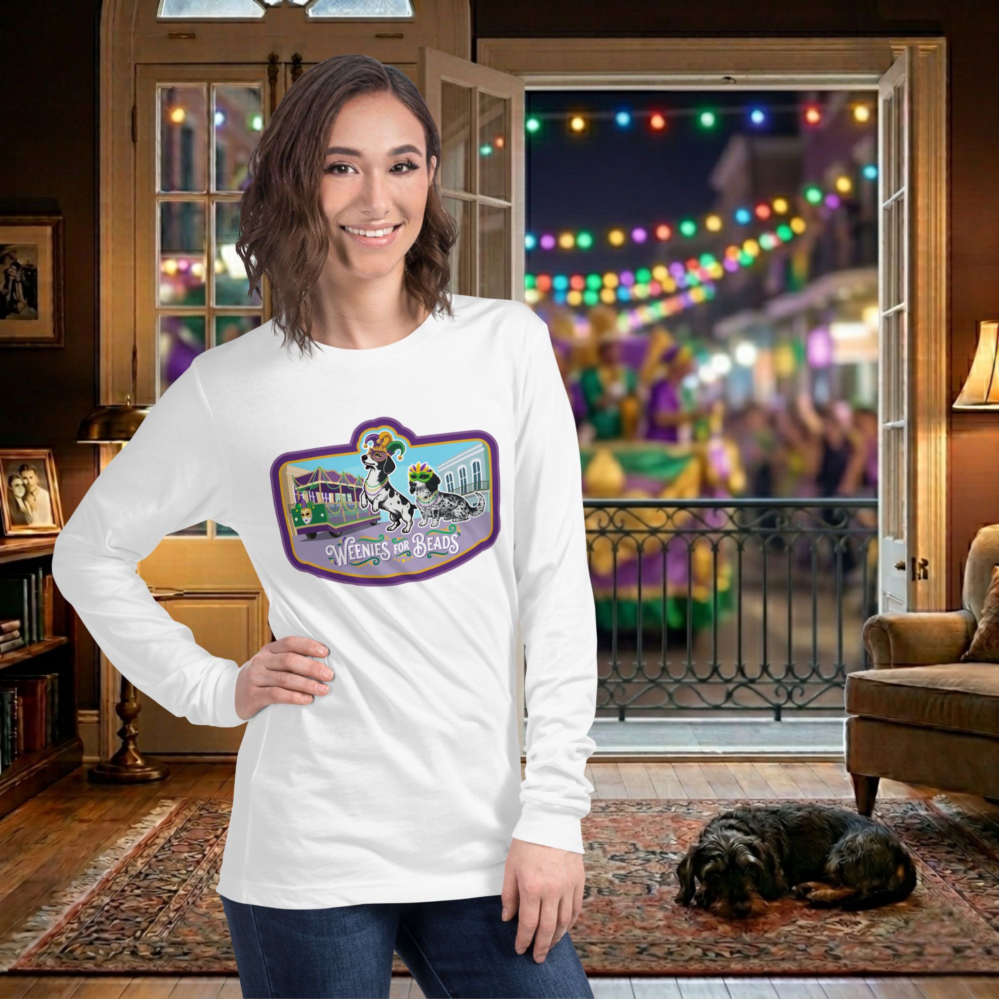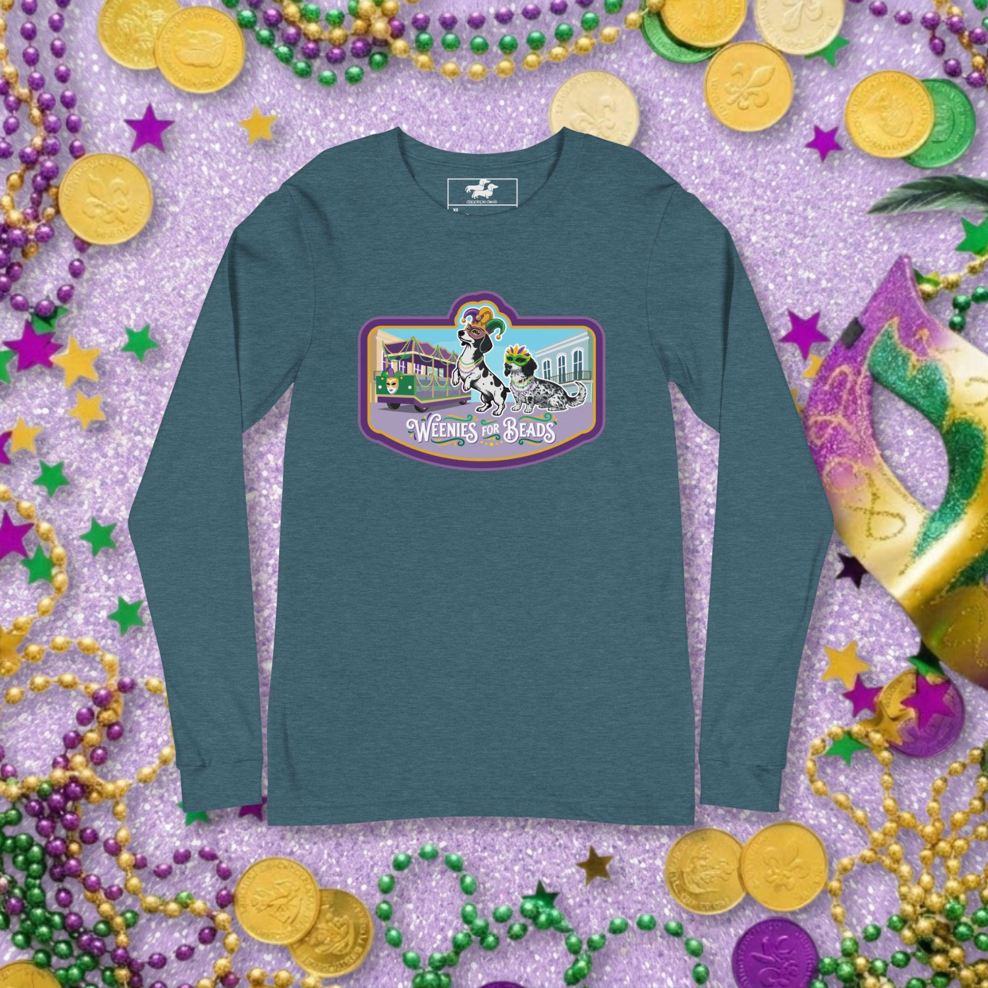 The exclusive “Weenies for Beads” design features a spirited dachshund decked out in traditional purple, green, and gold. It’s a playful nod to the breed’s legendary persistence—because we all know a Doxie will do just about anything for a prize! This long-sleeve version offers a bit more warmth for those crisp Carnival days while keeping the festive spirit front and center.