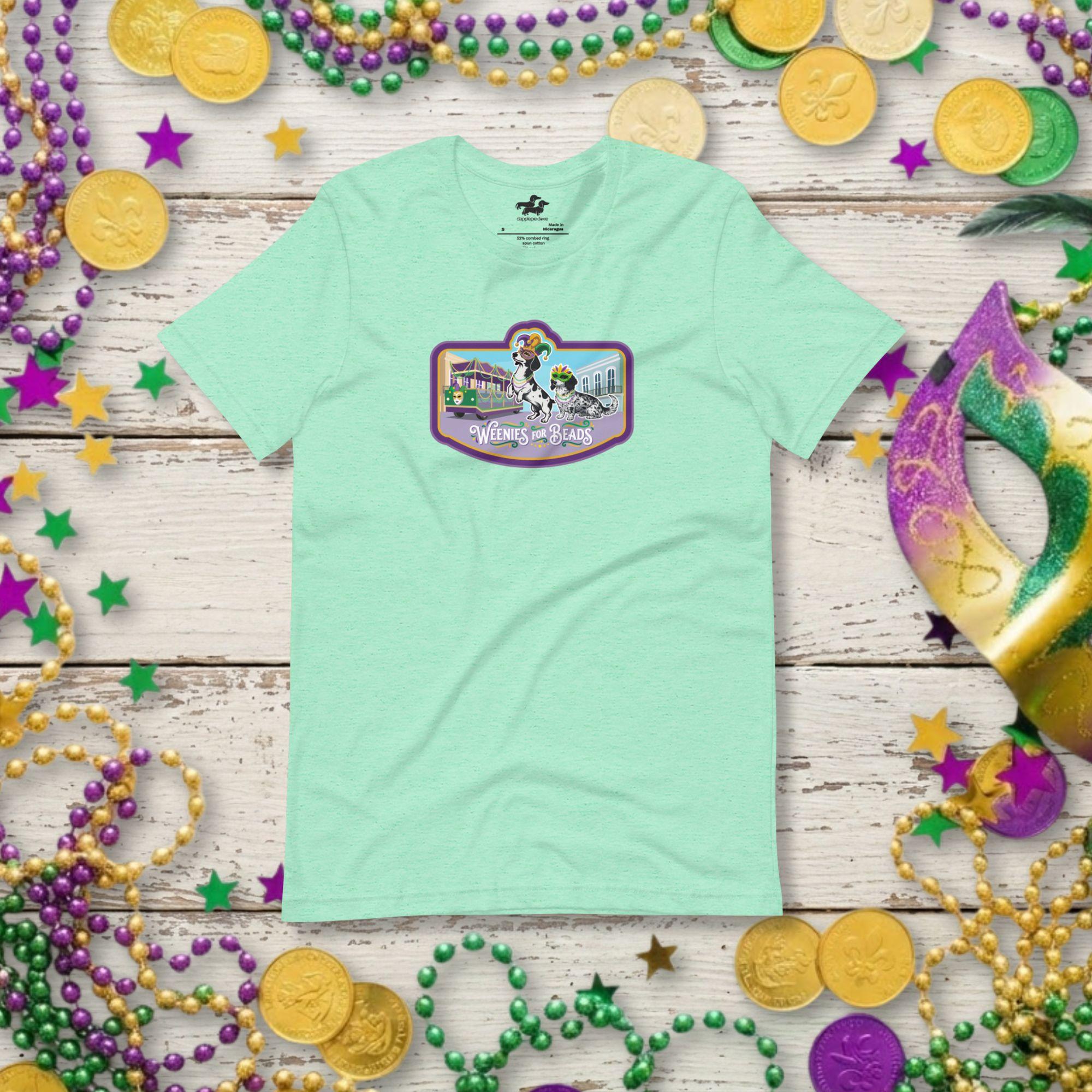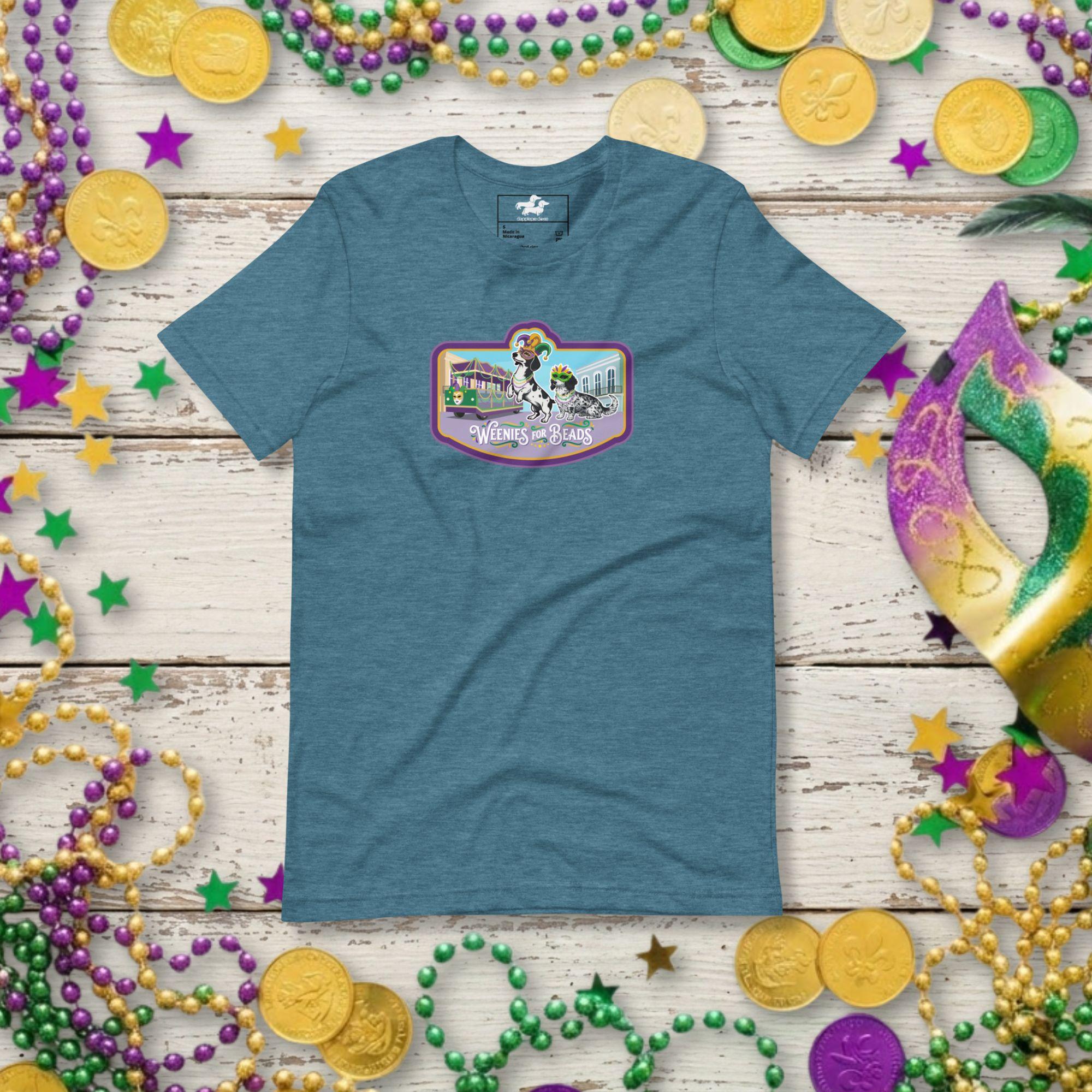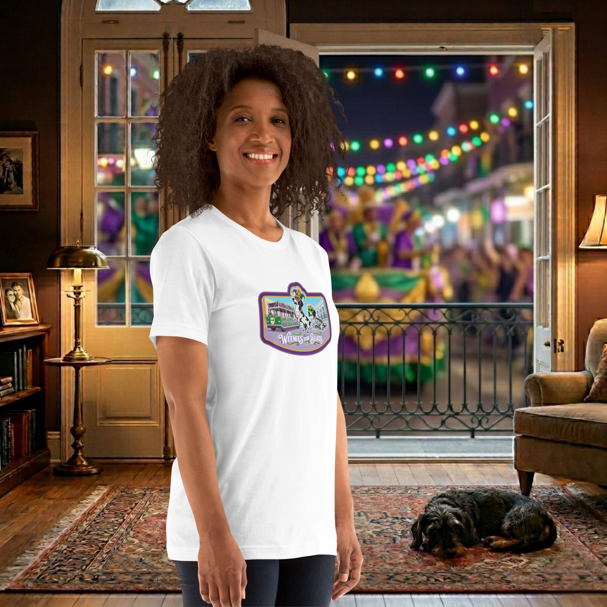 The exclusive “Weenies for Beads” design features a spirited dachshund decked out in traditional purple, green, and gold. It’s a playful nod to the breed’s legendary persistence—because we all know a Doxie will do just about anything for a prize! This tee brings the same adventurous spirit as our Weenie in the Wild collection, just with a lot more glitter and gold.