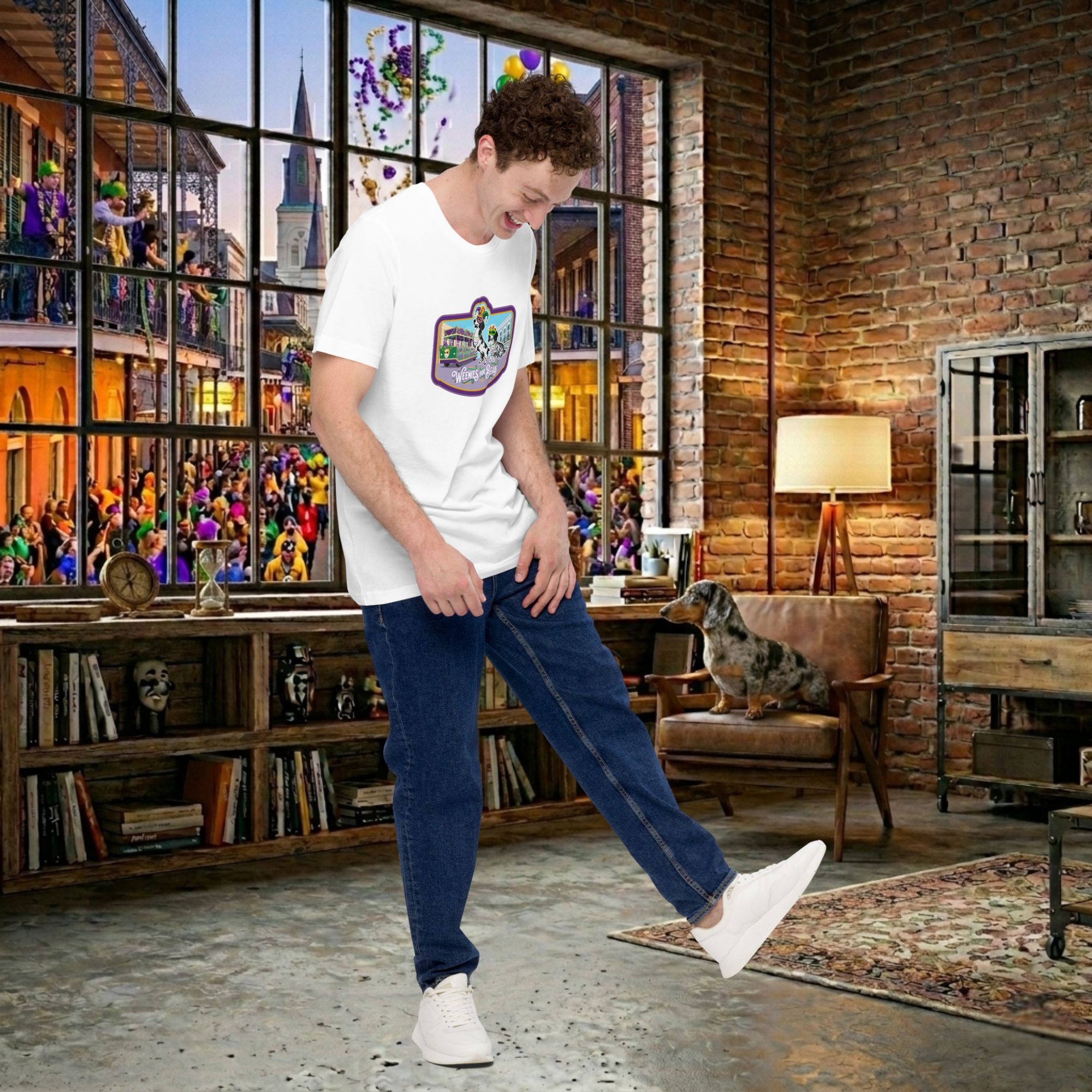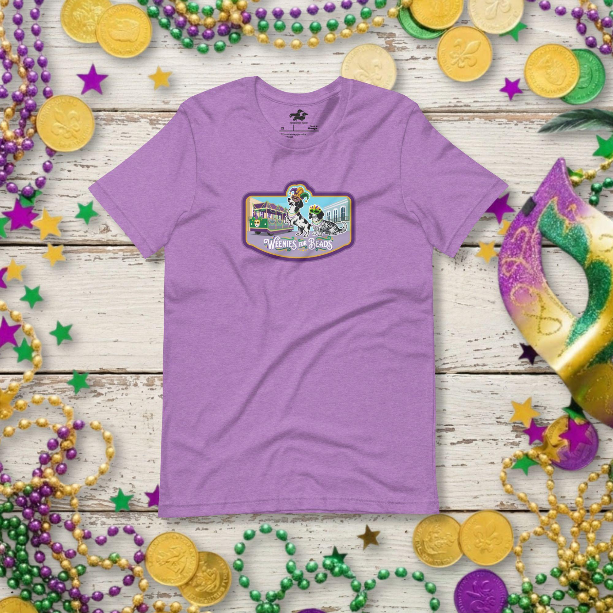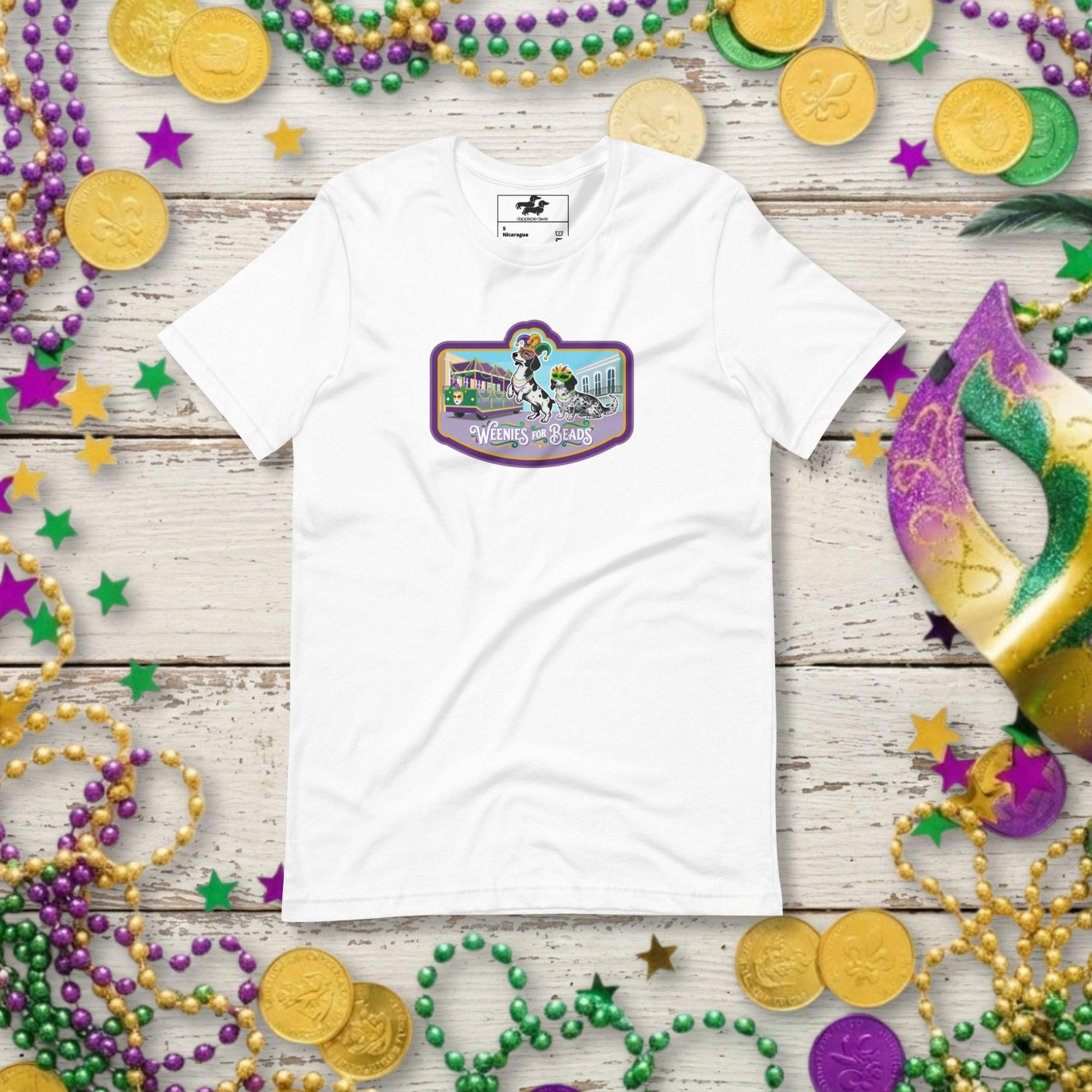 The Ultimate Mardi Gras Look for Doxie Fans! Celebrate Carnival season with our exclusive “Weenies for Beads” design, featuring a playful dachshund in traditional purple, green, and gold on a premium, soft-spun cotton tee. Whether you’re at a parade or a party, this festive unisex-fit shirt is the perfect way to show off your love for the long-and-low life in style.